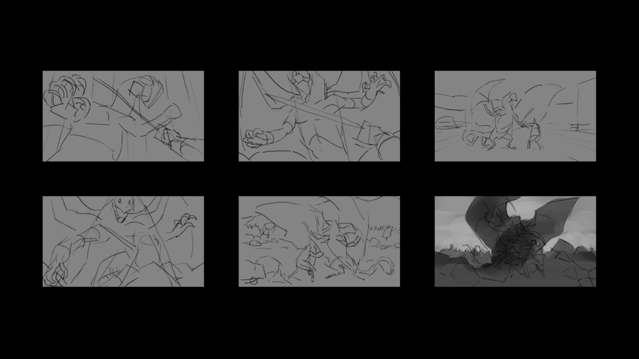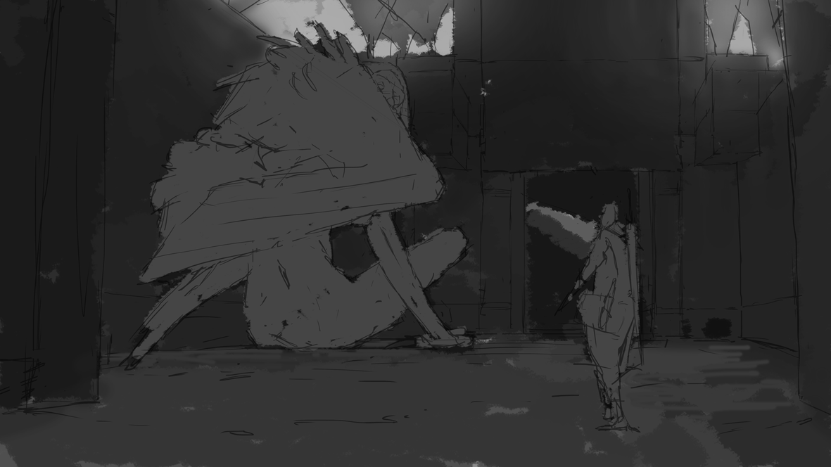 Concept design scenes where some previous character, objects and environment designs are applied with the intention to tell more about them in a specific situation.